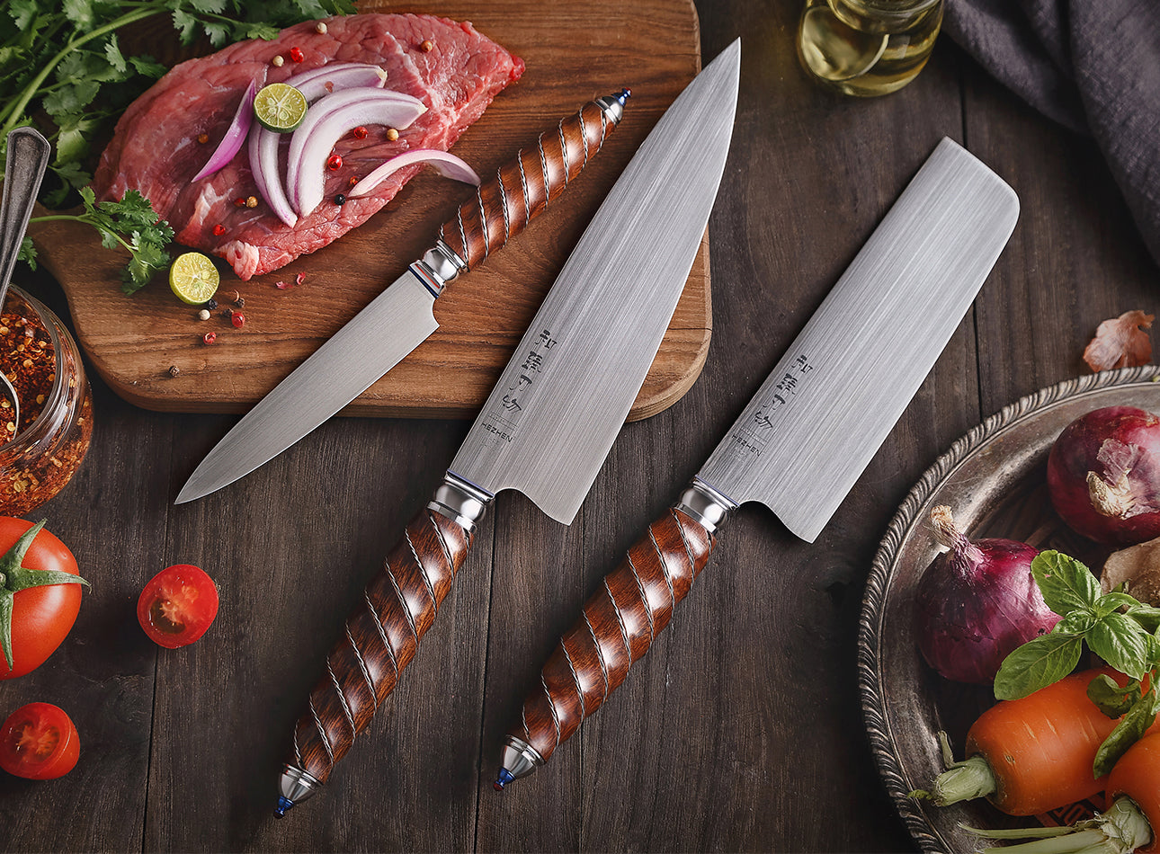 HEZHEN Retro Series Composite Steel Kitchen Knife Blade Material:3 Layers Composite Steel Handle Material:High quality Rosewood...